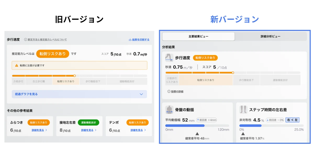 - 従来の「歩行速度」に加え、「骨盤」「足」の状態も分析